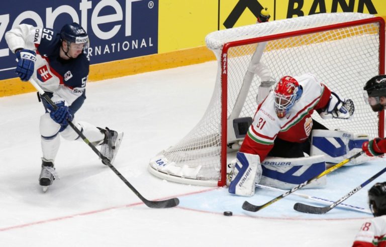 Slovenský útočník Tomáš Jurčo sa snaží prekonať maďarského brankára Miklosa Rajnu počas zápasu na svetovom šampionáte. Petrohrad, 7. máj 2016. Foto: SITA/AP