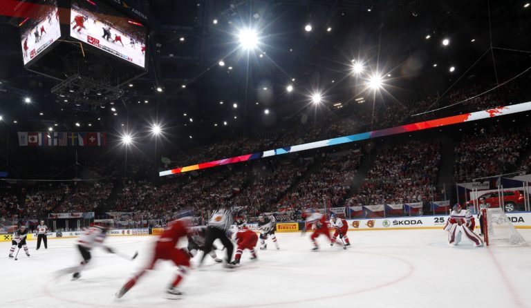 Vhadzovanie pred brankárom Petrom Mrázkom počas zápasu MS v hokeji 2017 medzi Českom a Kanadou. Paríž, 5. máj 2017. Foto: SITA/AP.