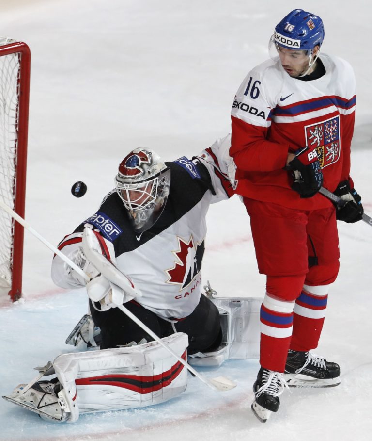 Zákrok kanadského brankára Calvina Pickarda po teči českého útočníka Michala Birnera počas zápasu na MS v hokeji 2017. Paríž, 5. máj 2017. Foto: SITA/AP