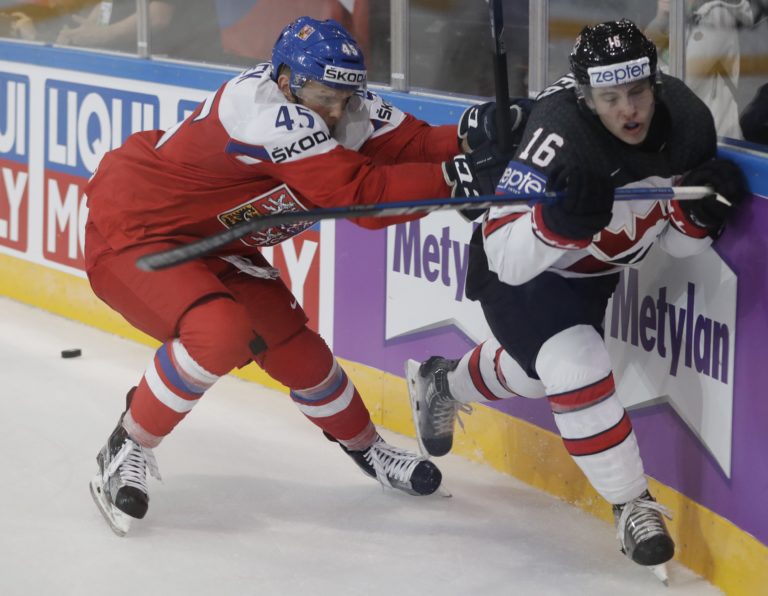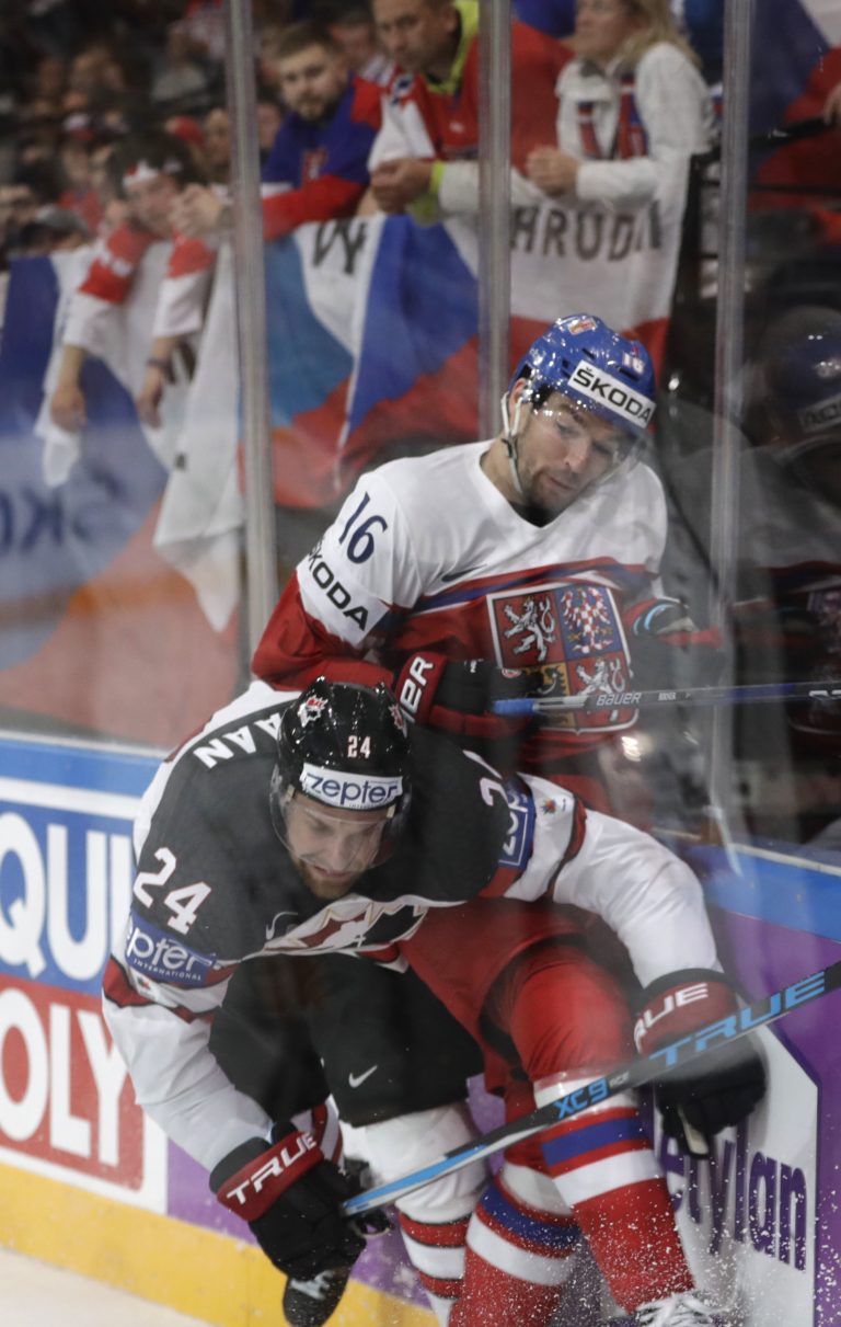 Český obranca Radim Šimek v súboji s kanadským útočníkom Mitchom Marnerom počas zápasu na MS v hokeji 2017. Paríž, 5. máj 2017. Foto: SITA/AP.