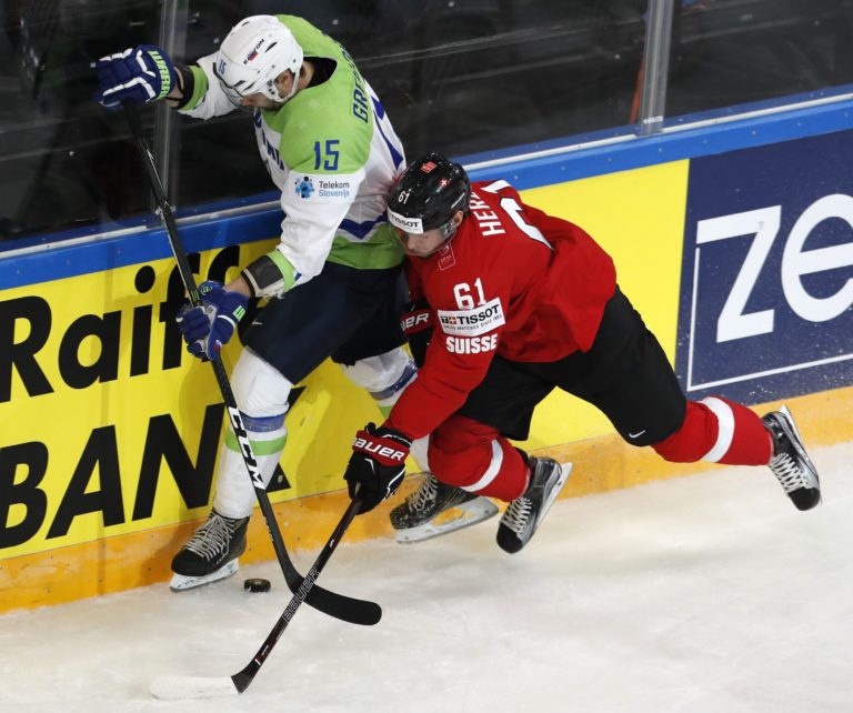 Slovinský obranca Blaz Gregorc v súboji so Švajčiarom Fabriceom Herzogom počas zápasu na MS v hokeji 2017. Paríž, 6. máj 2017. Foto: SITA/AP.