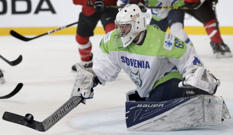 Zákrok slovinského brankára Matiju Pintariča počas zápasu proti Švajčiarom na MS v hokeji 2017. Paríž, 6. máj 2017. Foto: SITA/AP