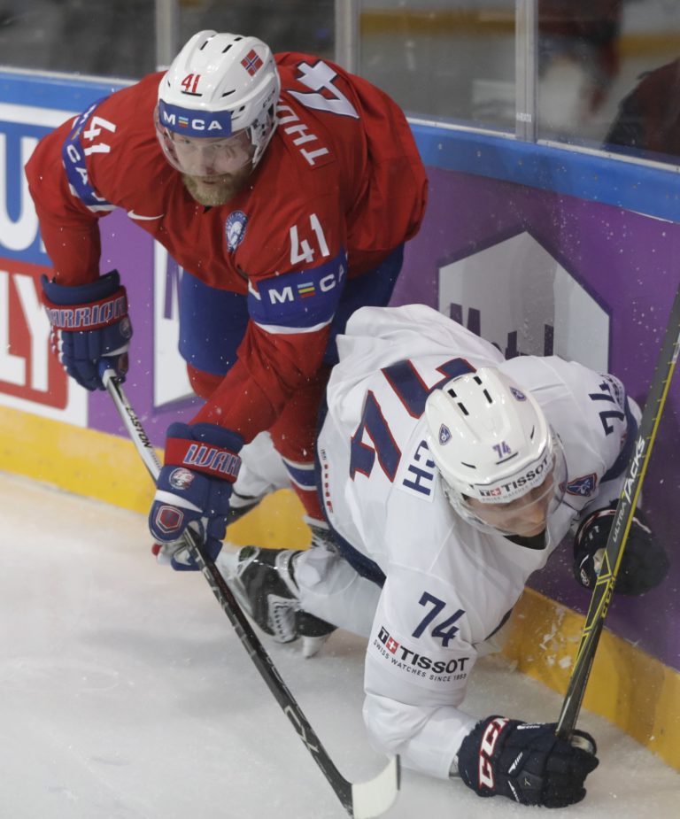 Nórsky útočník Patrick Thoresen v súboji s Francúzom Nicolasom Beschom počas zápasu na MS v hokeji 2017. Paríž, 6. máj 2017. Foto: SITA/AP.