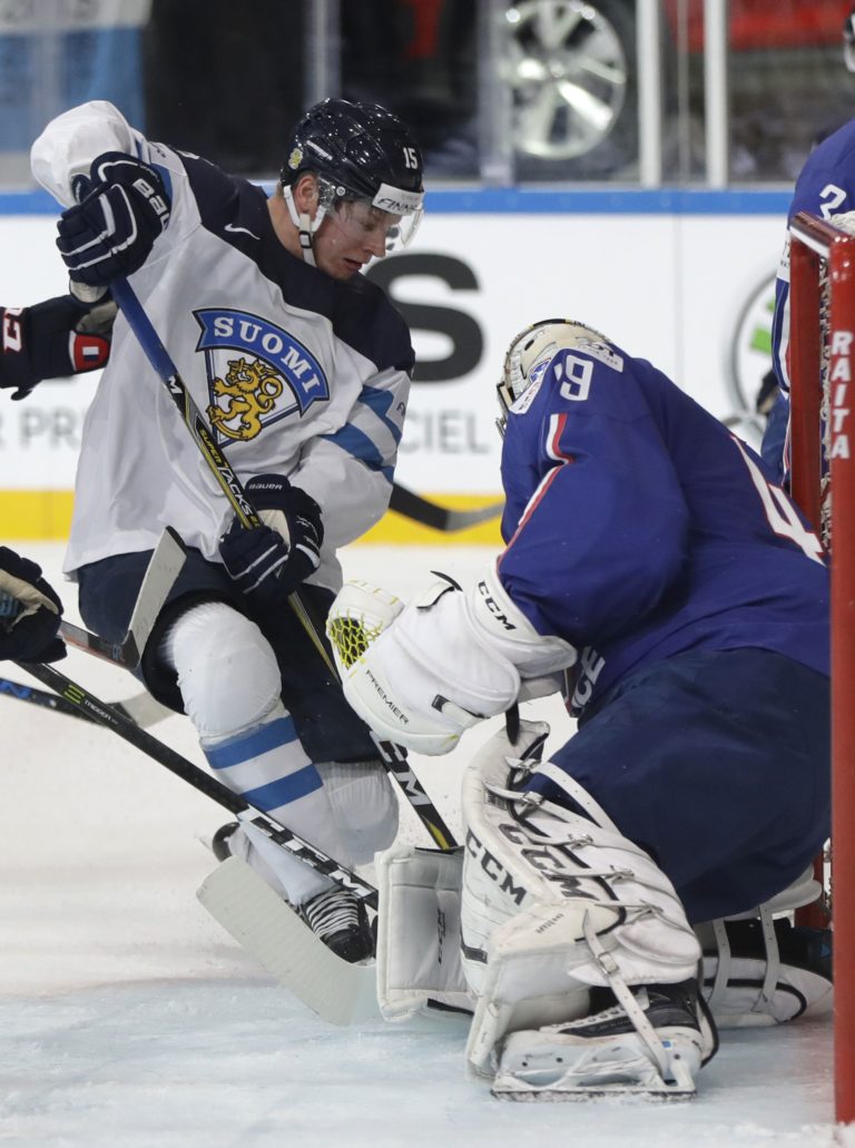 Fínsky útočník Miro Aaltonen sa snaží prekonať francúzskeho brankára Floriana Hardyduringa počas zápasu na MS v hokeji 2017. Paríž, 7. máj 2017. Foto: SITA/AP