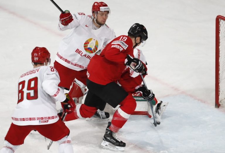 Švajčiar Reto Schappi skóruje do siete Bieloruska počas zápasu MS v hokeji 2017. Foto: SITA/AP