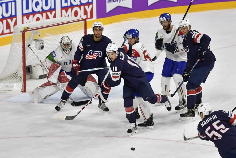 Situácia zo zápasu medzi Talianskom a USA počas MS v hokeji 2017. Foto: SITA/AP