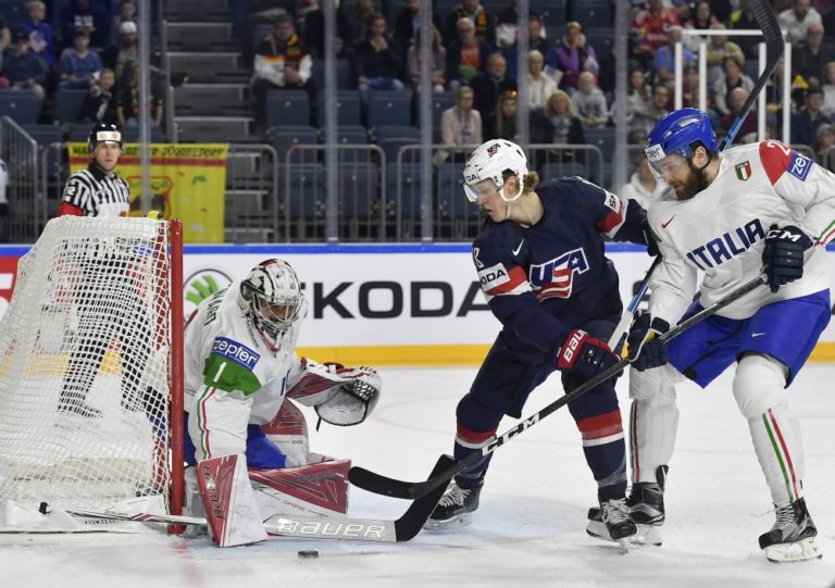 Hráč USA Christian Dvorak sa snaží prekonať talianskeho brankára Andreasa Bernarda počas zápasu MS v hokeji 2017. Foto: SITA/AP