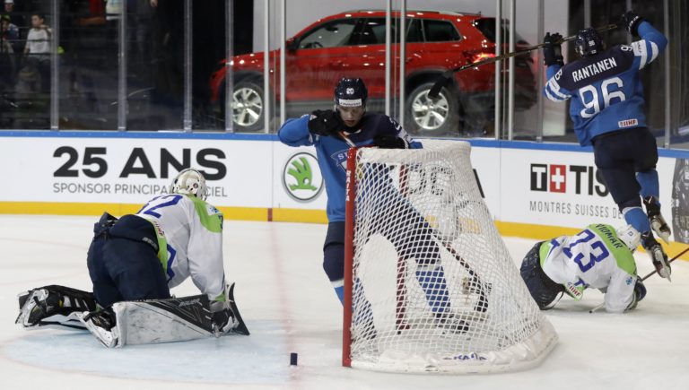 Slovinský obranca Luka Vidmar v súboji s fínskym útočníkom Mikkom Rantanenom za bránkou Gaspera Kroselja, ktorú posunul Sebastian Aho. Paríž, 10. máj 2017. Foto: SITA/AP.