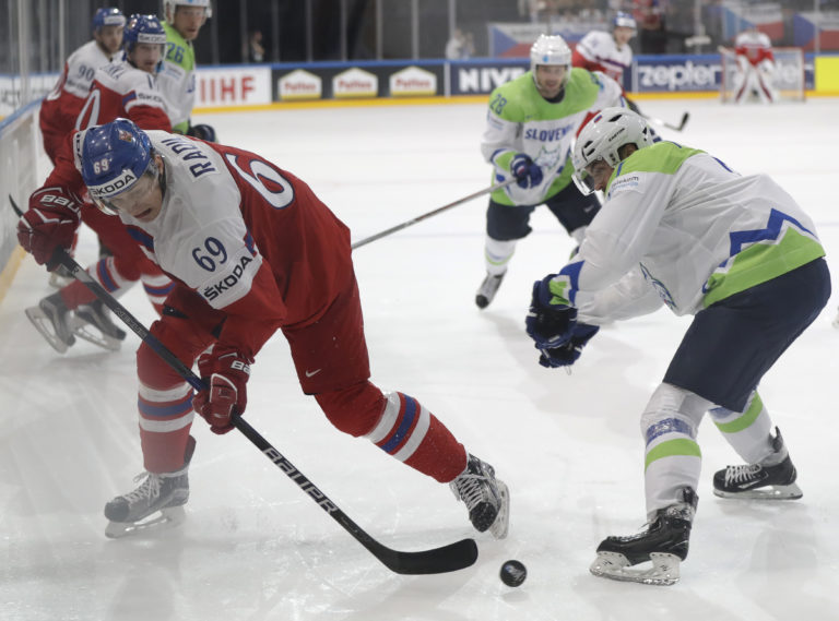 Slovinec Klemen Pretnar (vpravo) v súboji s Čechom Lukášom Radilom počas zápasu MS v hokeji 2017. Paríž, 12. máj, 2017. Foto: SITA/AP