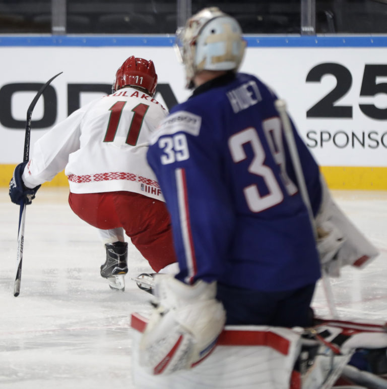 Bielorus Alexander Kulakov prekonáva brankára Francúzska Cristobala Hueta počas MS v hokeji 2017. Paríž, 12. máj, 2017. Foto: SITA/AP