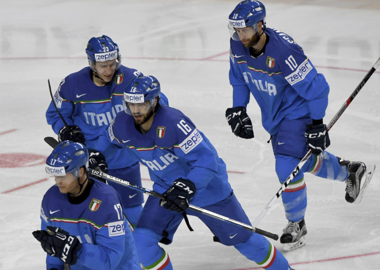 Hráči Talianska sa tešia z gólu v sieti Švédska počas zápasu na MS 2017. Kolín nad Rýnom, 12. máj 2017. Foto: SITA/AP