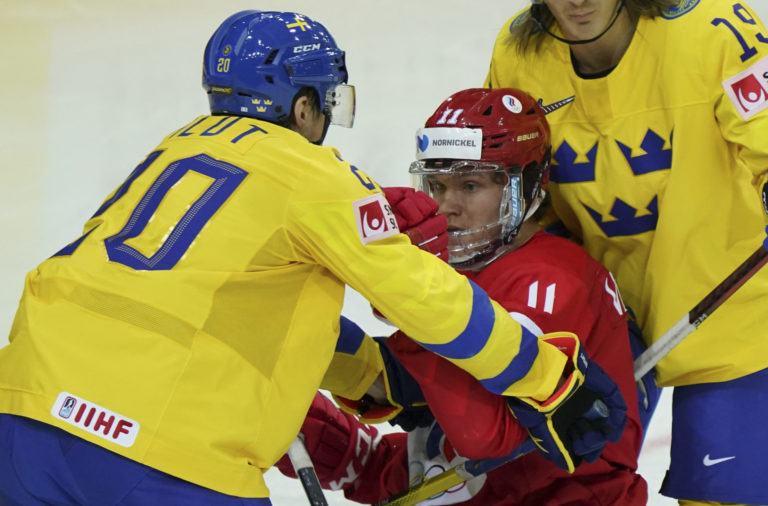Dmitrij Voronkov z Ruska (vpravo) a Lawrence Pilut zo Švédska v potýčke počas zápasu na MS v hokeji 2021. Riga, 31. máj 2021. Foto: SITA/AP