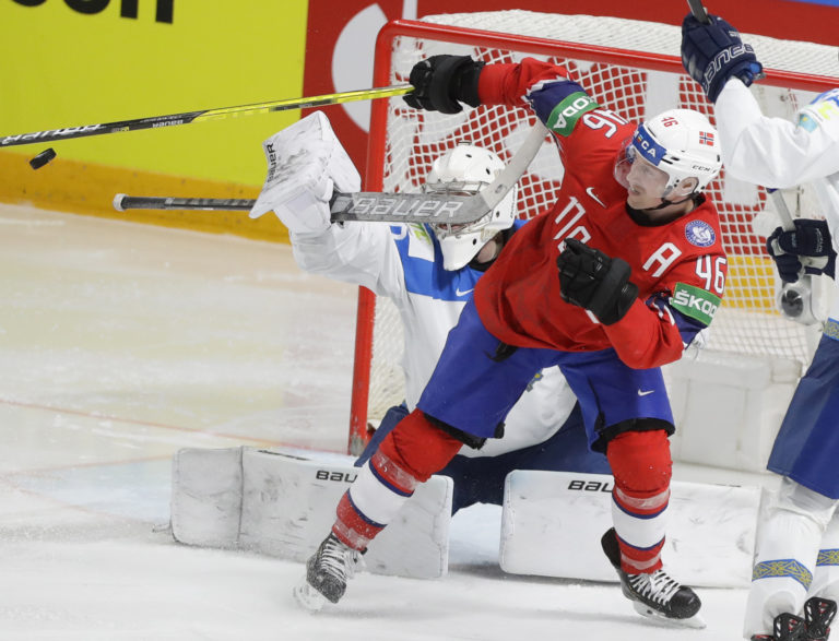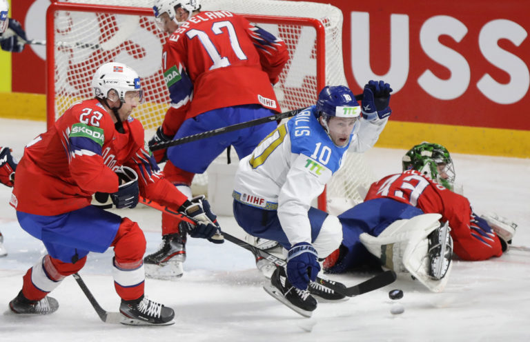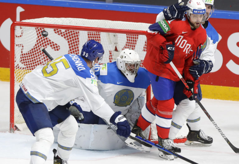 Brankár Kazachstanu Nikita Bojarkin inkasuje gól od Mathisa Olimba z Nórska počas zápasu na MS v hokeji 2021. Riga, 31. máj 2021. Foto: SITA/AP