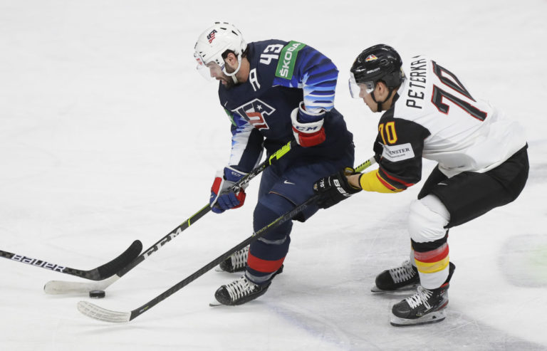 Nemec John Peterka sa snaží obrať o puk amerického útočníka Colina Blackwella počas zápasu na MS v hokeji 2021. Riga, 31. máj 2021. Foto: SITA/AP.