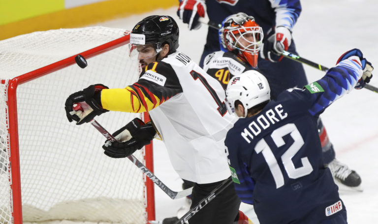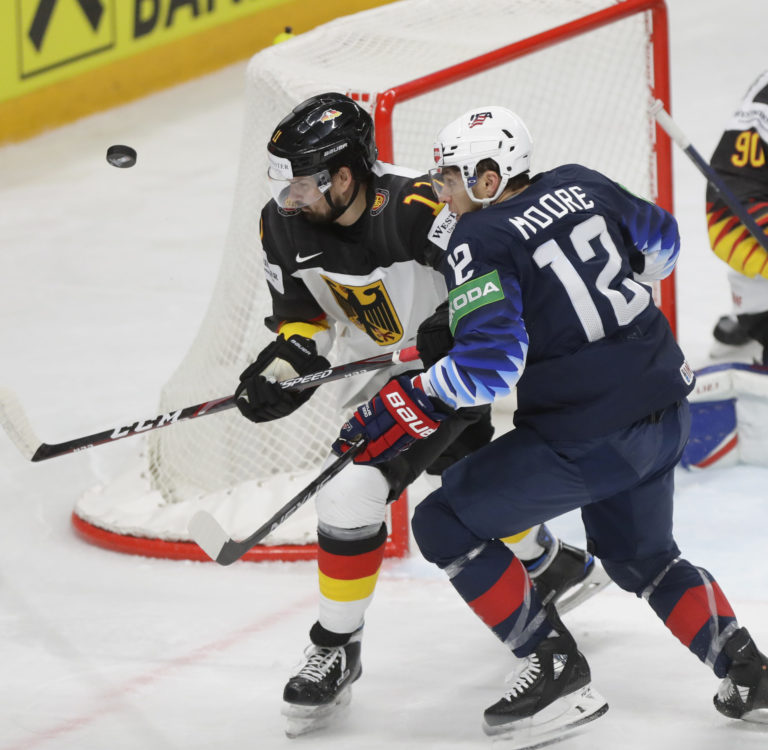 Americký útočník Trevor Moore v súboji s Nemcom Marcom Nowakom počas zápasu na MS v hokeji 2021. Riga, 31. máj 2021. Foto: SITA/AP.