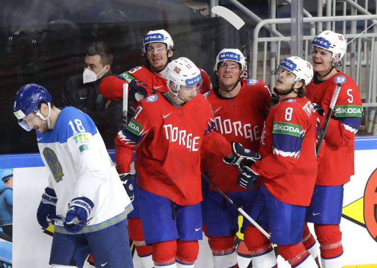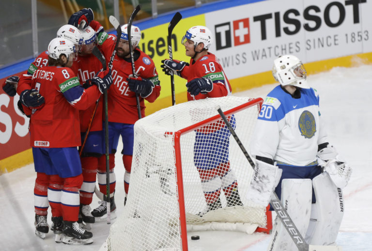 Nórski hokejisti sa tešia z gólu v bránke Kazachstanu počas zápasu na MS v hokeji 2021. Riga, 31. máj 2021. Foto: SITA/AP
