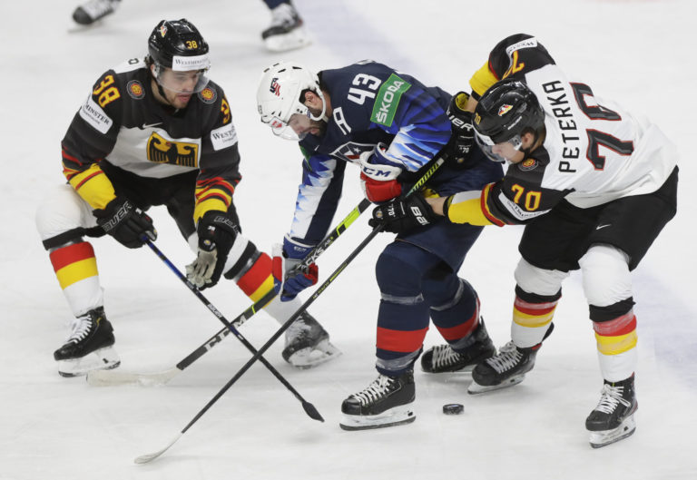Americký útočník Colin Blackwell v súboji s Nemcami Johnom Peterkom a Fabiom Wagnerom počas zápasu na MS v hokeji 2021. Riga, 31. máj 2021. Foto: SITA/AP.