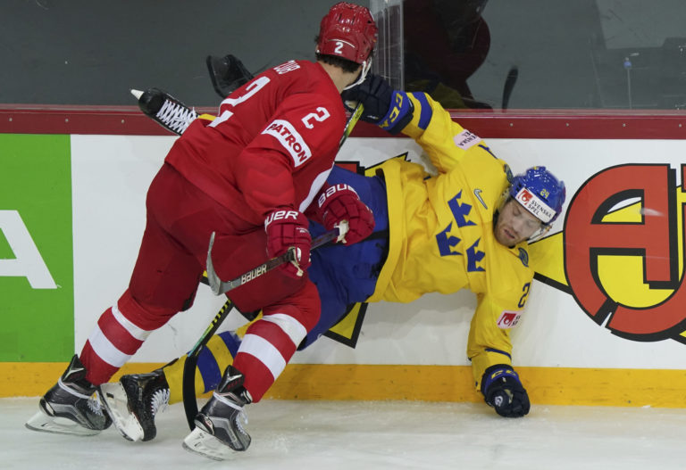 Arťom Zub z Ruska (vľavo) zráža na ľad Oscara Lindberga zo Švédska počas zápasu na MS v hokeji 2021. Riga, 31. máj 2021. Foto: SITA/AP
