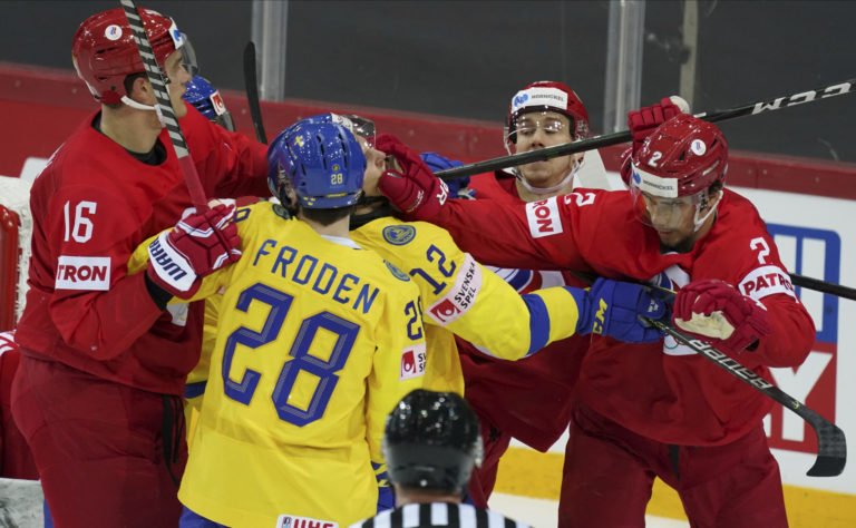Jesper Frödén zo Švédska (v strede) v potýčke s ruskými hráčmi počas zápasu na MS v hokeji 2021. Riga, 31. máj 2021. Foto: SITA/AP
