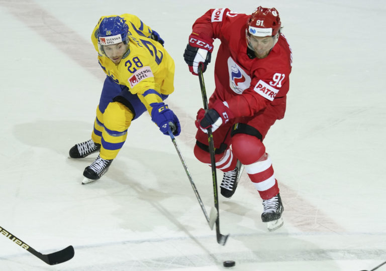 Vladimir Tarasenko z Ruska (vpravo) bojuje o puk s Jesperom Frödénom zo Švédska počas zápasu na MS v hokeji 2021. Riga, 31. máj 2021. Foto: SITA/AP