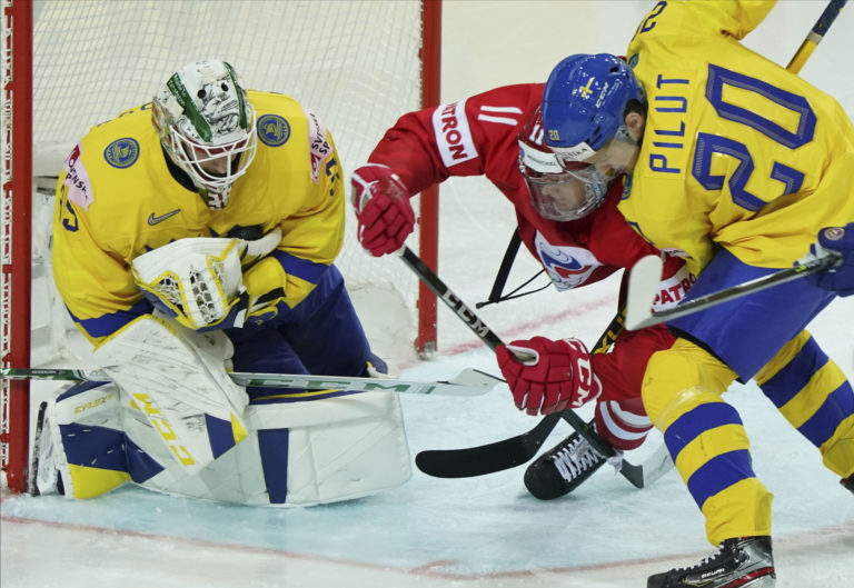 Anton Slepyšev z Ruska (vpravo) sa snaží prekonať švédskeho brankára Adama Reideborna počas zápasu na MS v hokeji 2021. Riga, 31. máj 2021. Foto: SITA/AP