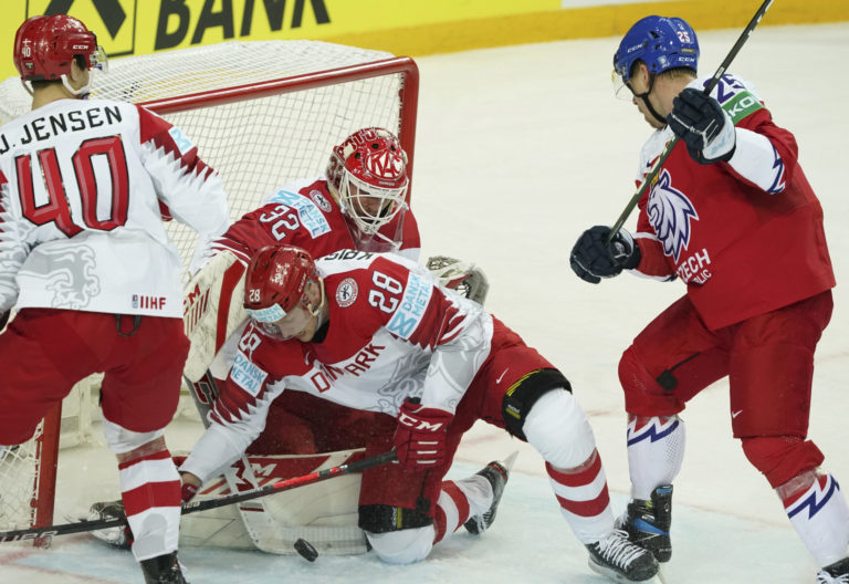 Zákrok dánskeho gólmana Sebastiana Dahna počas zápasu proti Česku na MS v hokeji 2021. Riga, 31. máj 2021. Foto: SITA/AP.