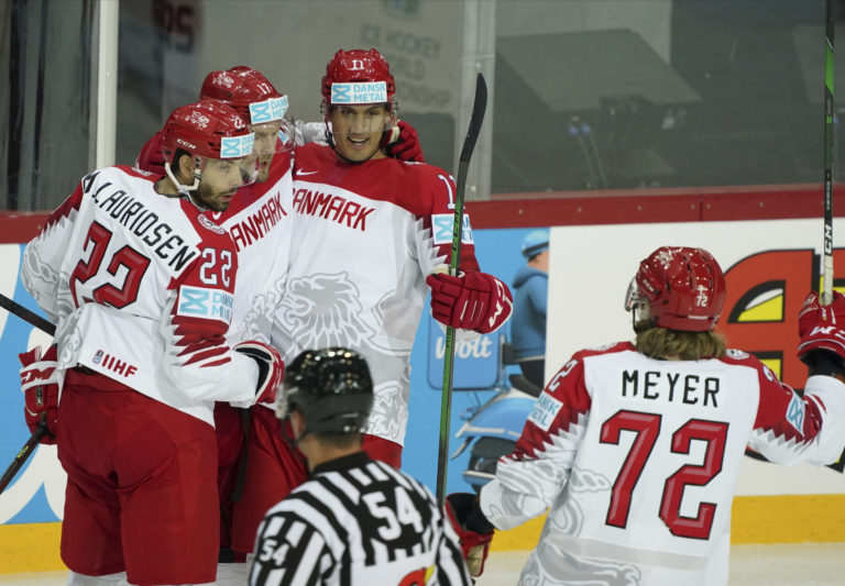 Radosť dánskych reprezentantov po góle Niklasa Jensena počas zápasu proti Česku na MS v hokeji 2021. Riga, 31. máj 2021. Foto: SITA/AP.