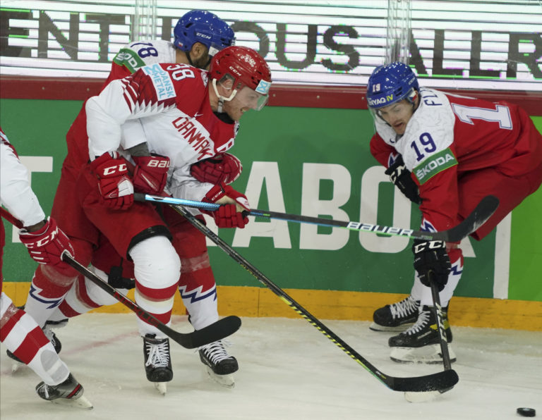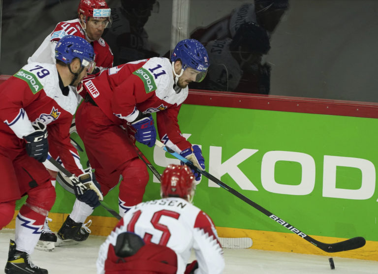 Dán Morten Poulsen v súboji s českými reprezentantmi počas zápasu na MS v hokeji 2021. Riga, 31. máj 2021. Foto: SITA/AP.