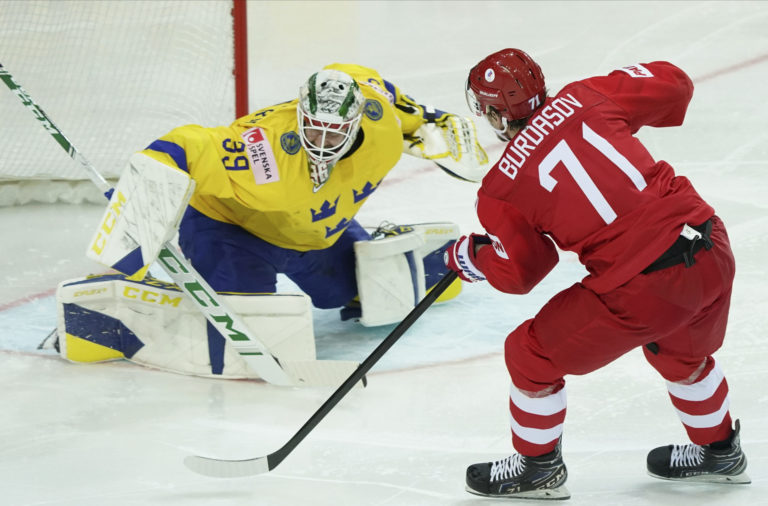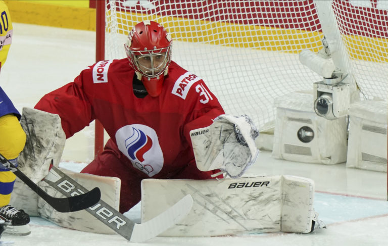 Ruský brankár Alexander Samonov zasahuje počas zápasu na MS v hokeji 2021 proti Švédsku. Riga, 31. máj 2021. Foto: SITA/AP