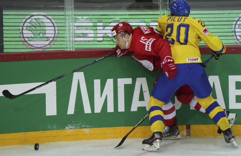 Pavel Karnaukov z Ruska (vľavo) bojuje o puk s Lawrenceom Pilutom zo Švédska počas zápasu na MS v hokeji 2021. Riga, 31. máj 2021. Foto: SITA/AP