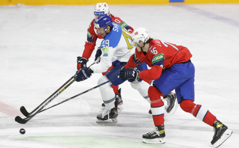 Alexander Šin z Kazachstanu (v strede) sa snaží presadiť medzi Emiliom Pettersenom a Emilom Lillebergom (vpravo) z Nórska počas zápasu na MS v hokeji 2021. Riga, 31. máj 2021. Foto: SITA/AP