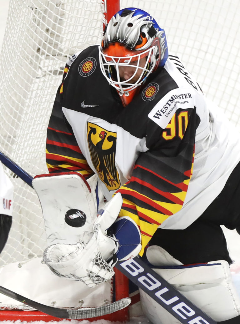 Zákrok nemeckého gólmana Felixa Bruckmanna v zápaseu proti USA na MS v hokeji 2021. Riga, 31. máj 2021. Foto: SITA/AP.