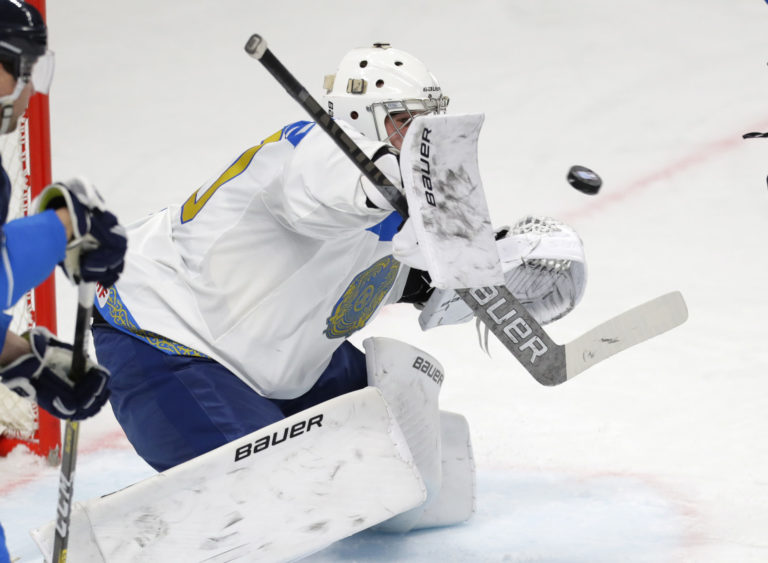 Brankár Kazachstanu Nikita Boyarkin zneškodňuje príležitosť Fínov počas zápasu na MS v hokeji 2021. Riga, 23. máj 2021. Foto: SITA/AP