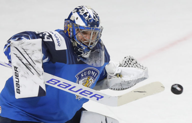 Brankár Fínska Harri Sateri zneškodňuje strelu Kazachstanu počas zápasu na MS v hokeji 2021. Riga, 23. máj 2021. Foto: SITA/AP