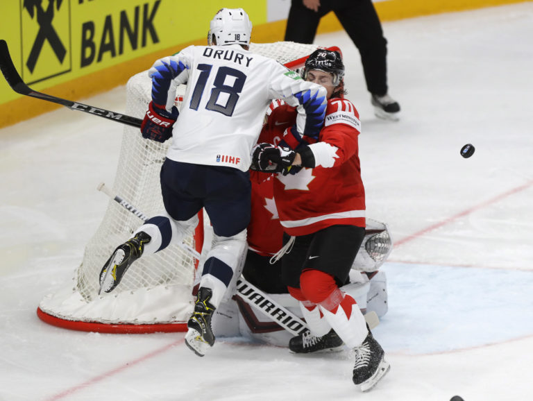 Hráč USA Jack Drury (vľavo) v súboji o puk s Kanaďanom Troyom Stecherom počas zápasu na MS v hokeji 2021. Riga, 23. máj 2021. Foto: SITA/AP