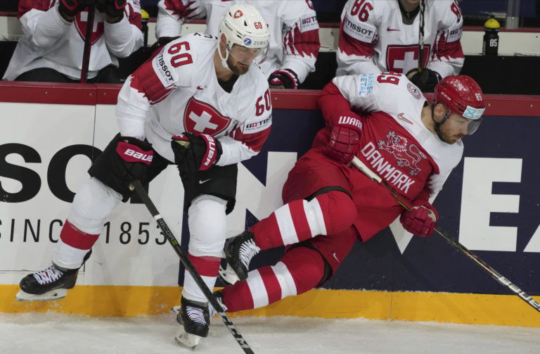 Dán Nick Olesen (vpravo) sa snaží prekonať brankára Reta Berru zo Švajčiarska počas zápasu na MS v hokeji 2021. Riga, 23. máj 2021. Foto: SITA/AP