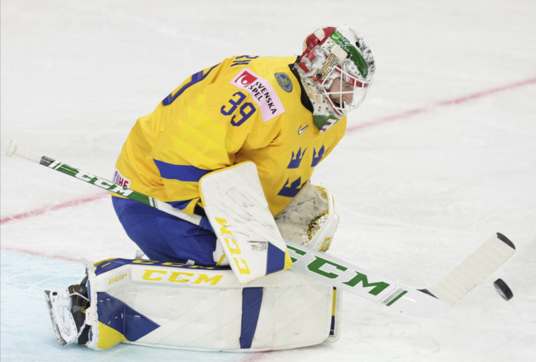 Švédsky brankár Adam Reideborn zneškodňuje bieloruskú príležitosť počas zápasu na MS v hokeji 2021. Riga, 23. máj 2021. Foto: SITA/AP