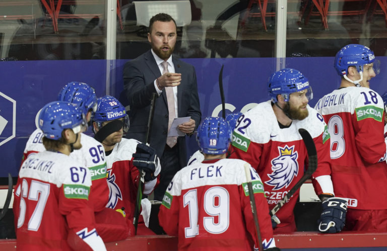 Tréner českej reprezentácie Filip Pešan počas zápasu proti Švédsko na MS v hokeji 2021. Riga, 27. máj 2021. Foto: SITA/AP.