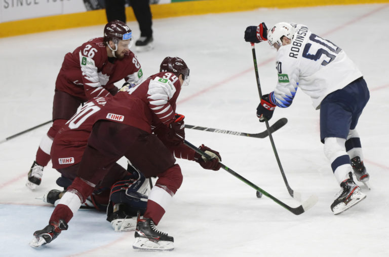 Američan Eric Robinson sa snaží prekonať lotyšského gólmana Matissa Kivlenieksa počas zápasu na MS v hokeji 2021. Riga, 27. máj 2021. Foto: SITA/AP.