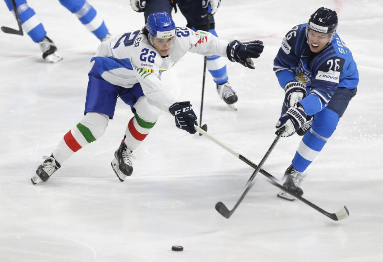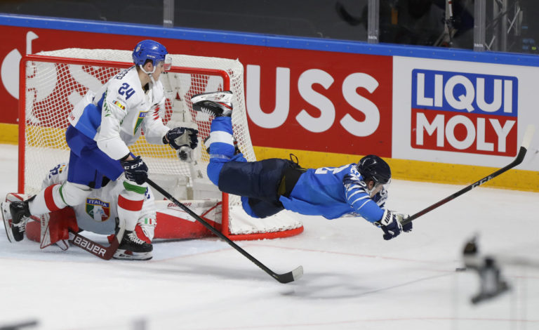 Fínsky útočník Arttu Ruotsalainen prekonáva talianskeho gólmana Justina Fazia počas zápasu na MS v hokeji 2021. Riga, 27. máj 2021. Foto: SITA/AP.