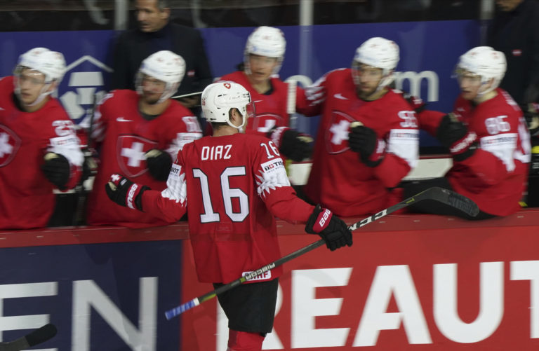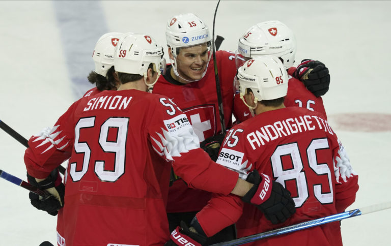 Švajčiar Raphael Diaz sa so spoluhráčmi teší zo svojho gólu v sieti Slovenska počas zápasu na MS v hokeji 2021. Riga, 27. máj 2021. Foto: SITA/AP.