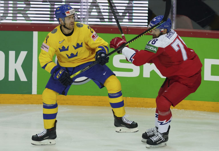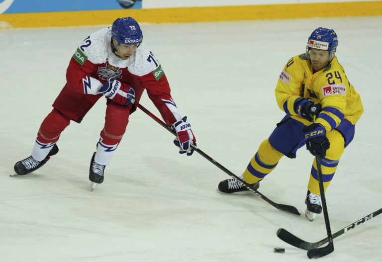 Švéd Oscar Lindberg v súboji s českým útočníkom Filipom Chytilom počas zápasu na MS v hokeji 2021. Riga, 27. máj 2021. Foto: SITA/AP.