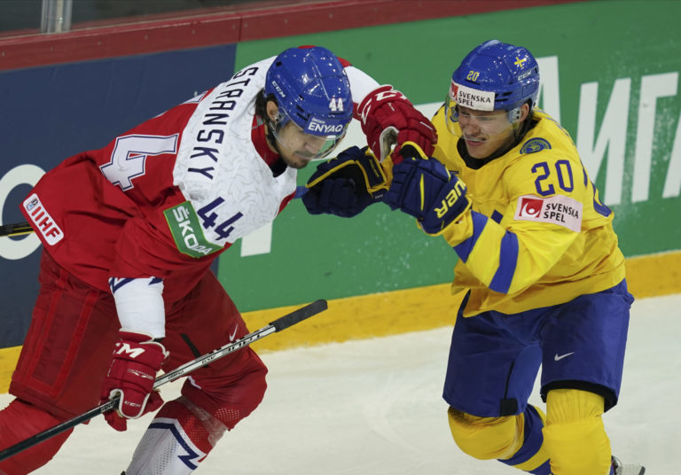 Švédsky obranca Jonathan Pudas v súboji s Čechom Janom Kovářom počas zápasu na MS v hokeji 2021. Riga, 27. máj 2021. Foto: SITA/AP.