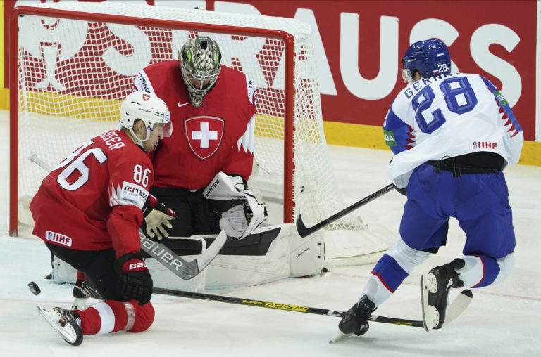 Zákrok švajčiarskeho gólmana Reta Berru po zakončení Slováka Martina Gernáta počas zápasu na MS v hokeji 2021. Riga, 27. máj 2021. Foto: SITA/AP.