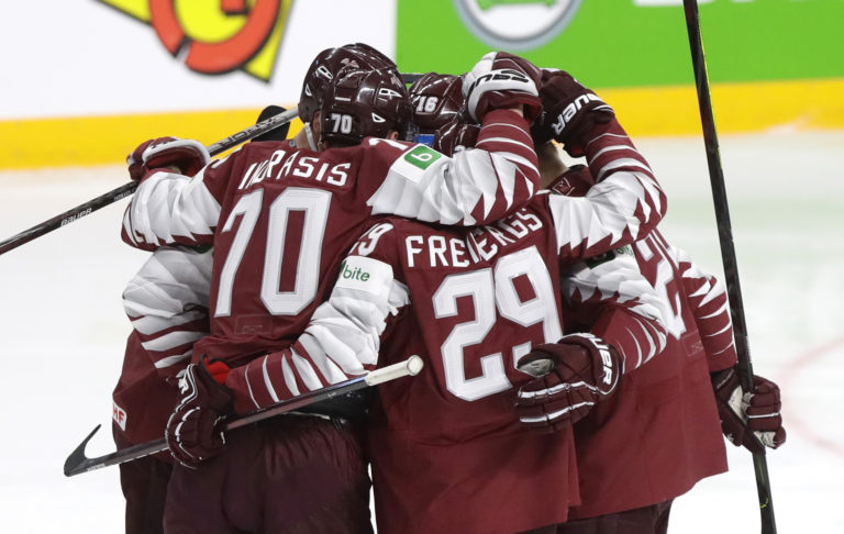 Lotyšský útočník Miks Indrašis sa teší zo svojho gólu v sieti USA počas zápasu na MS v hokeji 2021. Riga, 27. máj 2021. Foto: SITA/AP.