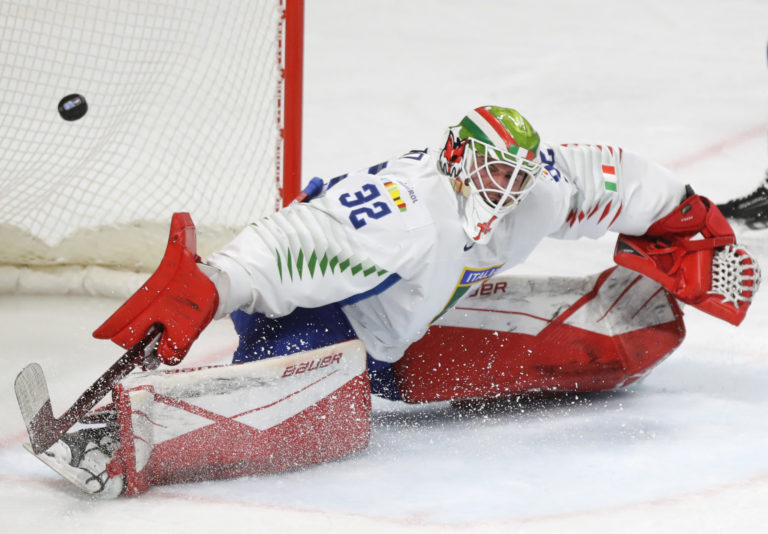 Prekonaný taliansky brankár Justin Fazio počas zápasu proti Fínsku na MS v hokeji 2021. Riga, 27. máj 2021. Foto: SITA/AP.