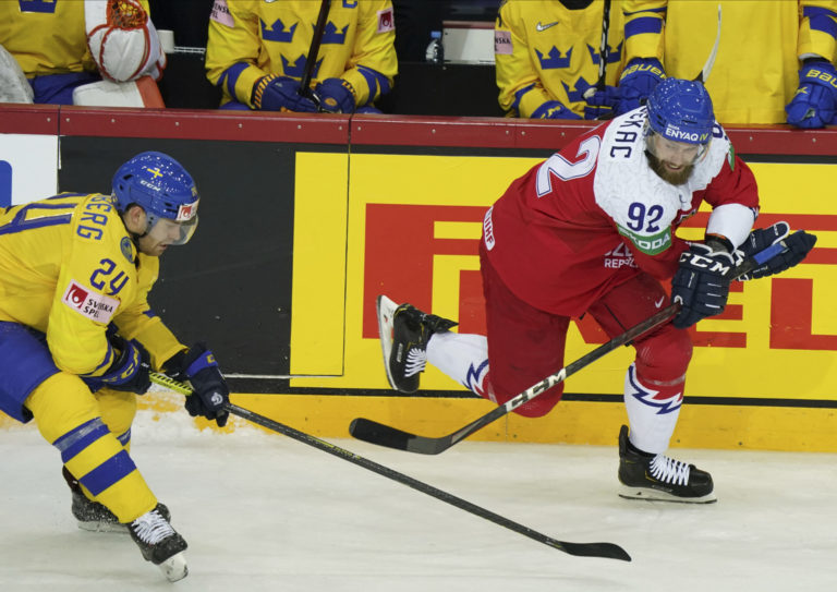 Švéd Oscar Lindberg v súboji s českým útočníkom Robinom Hanzlom počas zápasu na MS v hokeji 2021. Riga, 27. máj 2021. Foto: SITA/AP.