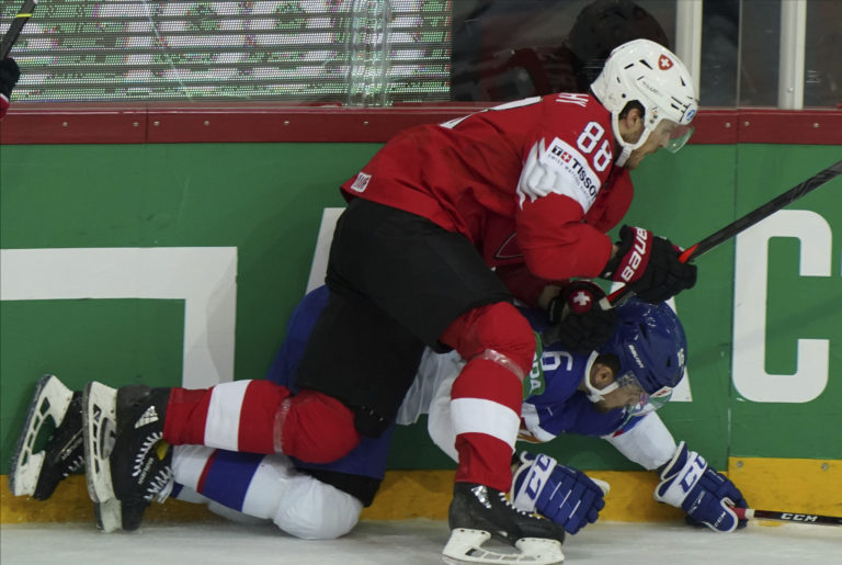 Švajčiarsky útočník Nico Hischier padá po súboji so slovenským obrancom Danielom Gachulincom počas zápasu na MS v hokeji 2021. Riga, 27. máj 2021. Foto: SITA/AP.