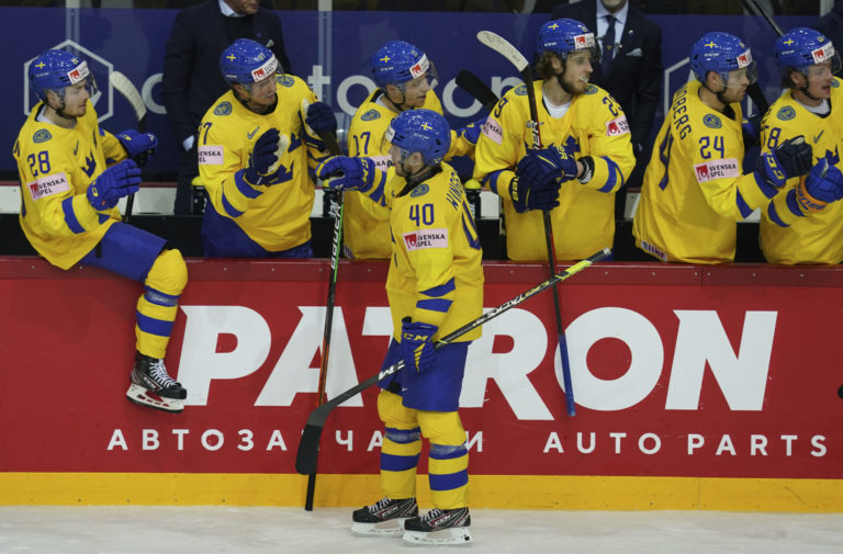 Švédsky útočník Andreas Wingerli sa sa spoluhráčmi teší zo svojho gólu v sieti Česka počas zápasu na MS v hokeji 2021. Riga, 27. máj 2021. Foto: SITA/AP.