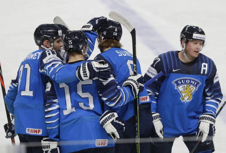 Fínsky útočník Arttu Ruotsalainen sa so spoluhráčmi teší zo svojho gólu v sieti Talianska počas zápasu na MS v hokeji 2021. Riga, 27. máj 2021. Foto: SITA/AP.
